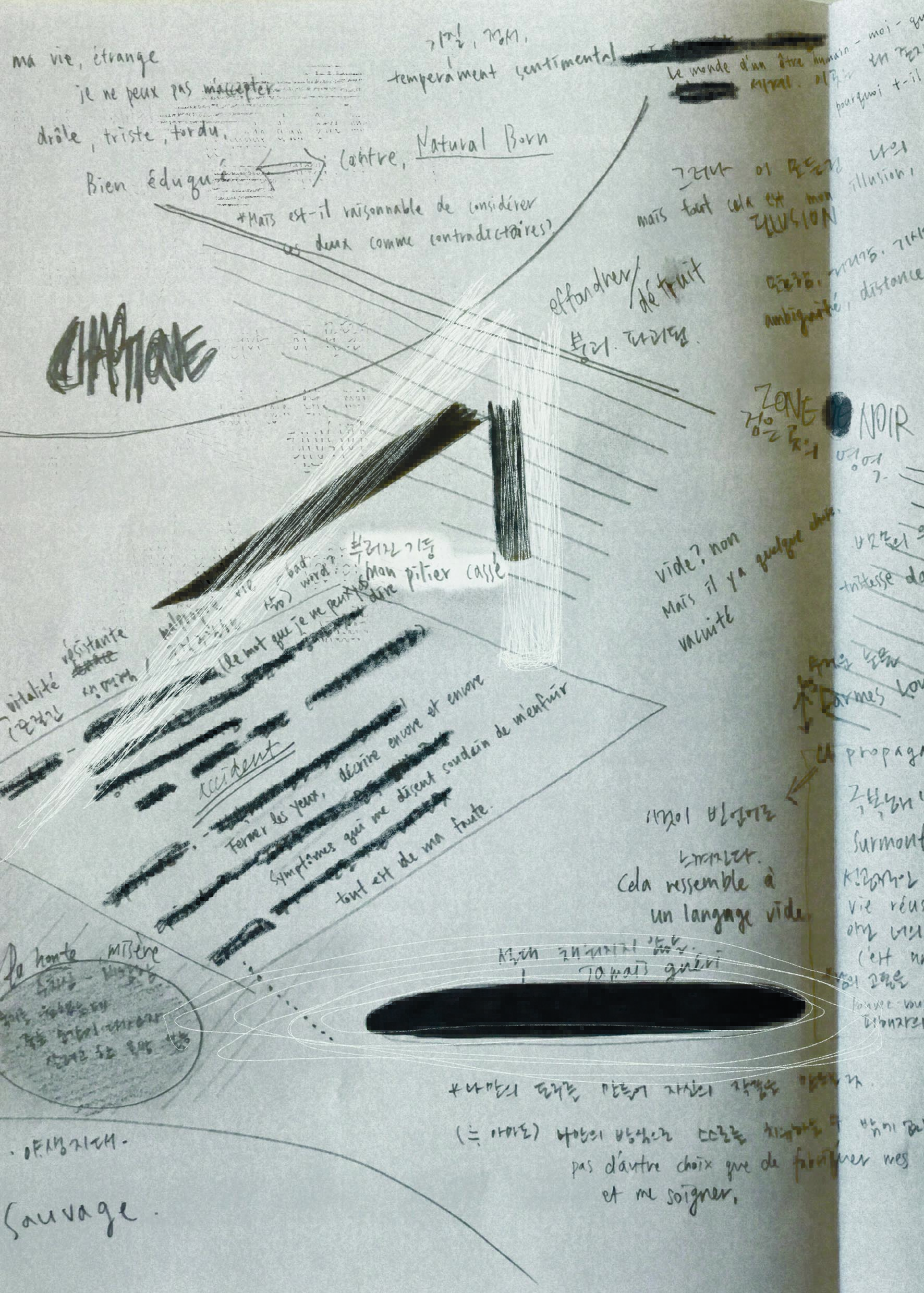 Dans les œuvres de Suj O, il y a donc son histoire mais aussi les histoires d’avant, celles de ses ancêtres. Des histoires qu’elle connaît, mais qui ne font pas toujours sens. D’autres histoires qu’elle ignore mais qu’elle porte en elle. Suj est ici à la maison ; l’artiste est venu accrocher ses dessins et nous invite ainsi à traverser son histoire, en interrogeant la nôtre dans le même élan. Une quête psychogénéalogique qui lui permet de questionner ses racines, de chercher où se trouvent ses piliers les plus solides.